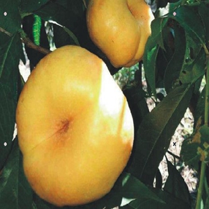 7月上旬成熟,果實(shí)扁圓形,自花結(jié)實(shí),平均單果重260克,大果450克,果肉金黃,硬溶質(zhì),風(fēng)味濃甜,可溶性固形物15%,極豐產(chǎn)。