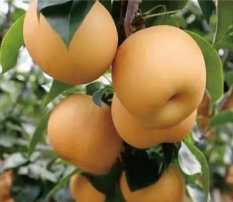 新華梨:日本品種“新高”母本,“華山”父本進行雜交。8月中旬成熟,果個均勻,單果重400克,抗病能力強,掛樹期長,晚至十月仍不軟脆甜,果實近圓形,果面金黃色,十分漂亮??纱竺娣e發(fā)展。