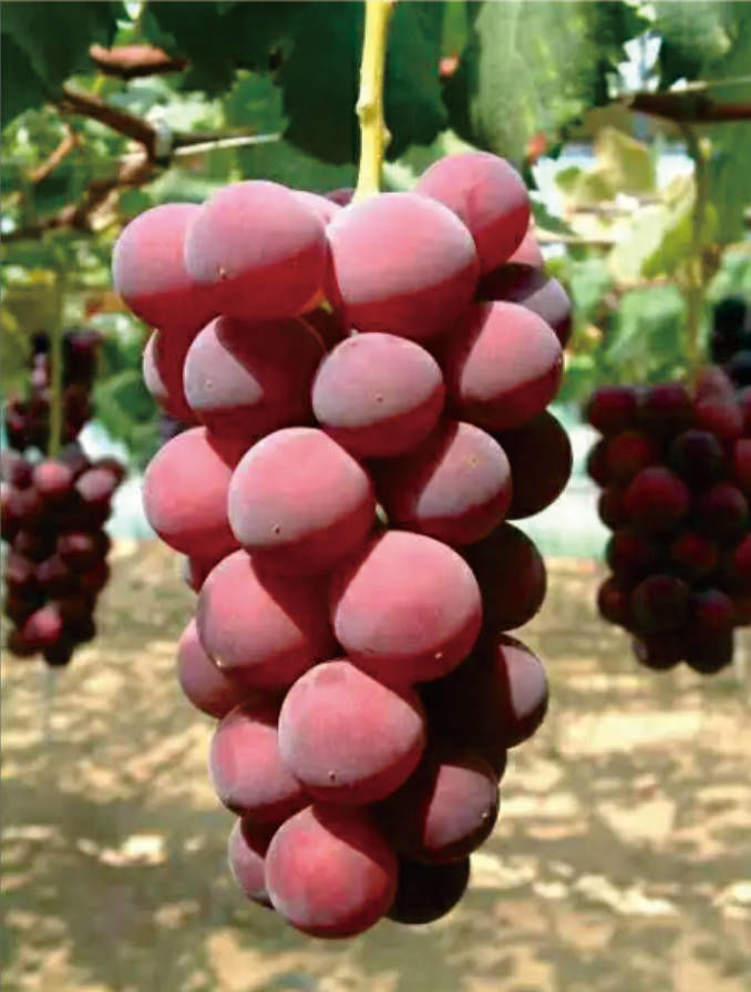 果實(shí)在9月份成熟,品質(zhì)優(yōu)良的中晚熟葡萄,平均單粒重15克,最大可達(dá)17克以上,味道好,糖度可達(dá)25-27度,既有草莓香味又有牛奶香味,成熟的果實(shí)顏色為紅色,表面帶有白霜,豐產(chǎn)性好、無(wú)核化處理后,品質(zhì)更佳。株價(jià):10元,百株價(jià):8元,千株價(jià)7元。